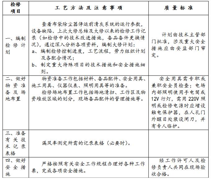 化工廠布袋除塵器工藝方法和檢修注意事項,質(zhì)量標準看下圖: